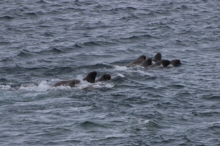 These giant tubes of blubber (walruses and seals) are affectionately known by our guides as ‘polar bear sausages’, though it is much harder for a polar bear to catch a walrus than a seal, and even a seal only falls victim to a polar bear’s huge paws and jaws less than 10% of the time. Ungainly on land, they swim with grace, barely making a ripple on the sea. Young walruses stick together in the water. On land, the herd congregates in a tightly-packed group to conserve body heat, for protection and because they are highly social.