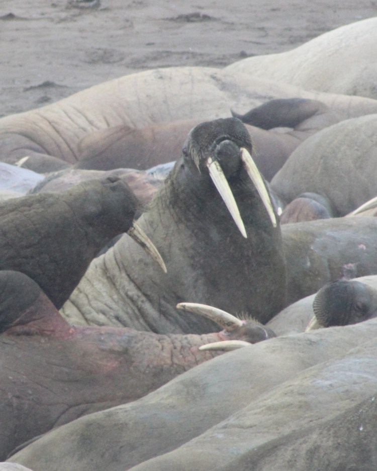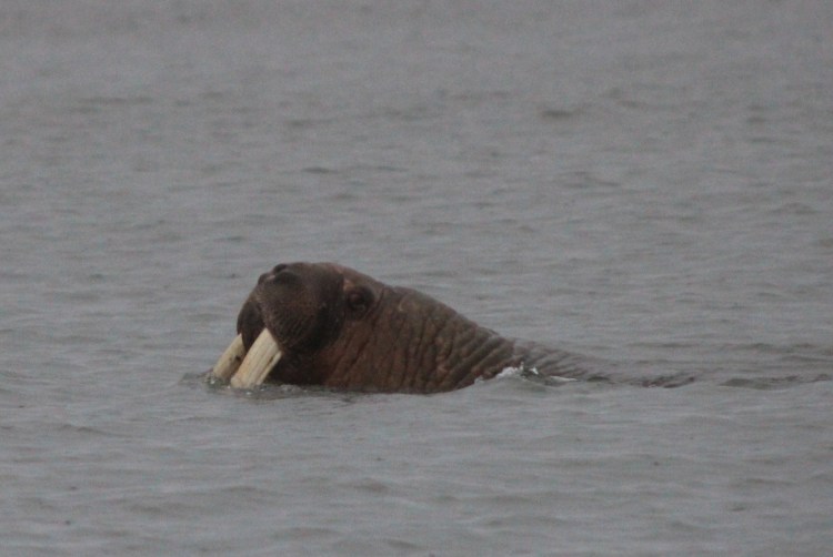 It was only on my recent trip to the Arctic that I learned that walruses are related to seals, being pinnipeds (which means fin-footed). Obvious once someone points it out, but even more so when I witnessed a walrus without tusks, after seeing their close relative the bearded seal. Both male and female walruses (bulls and cows) use their tusks for raking the seafloor in the search for food such as clams. The bulls also use them for fighting and showing dominance – the larger the tusk, the more likely the bull is to have mating rights.